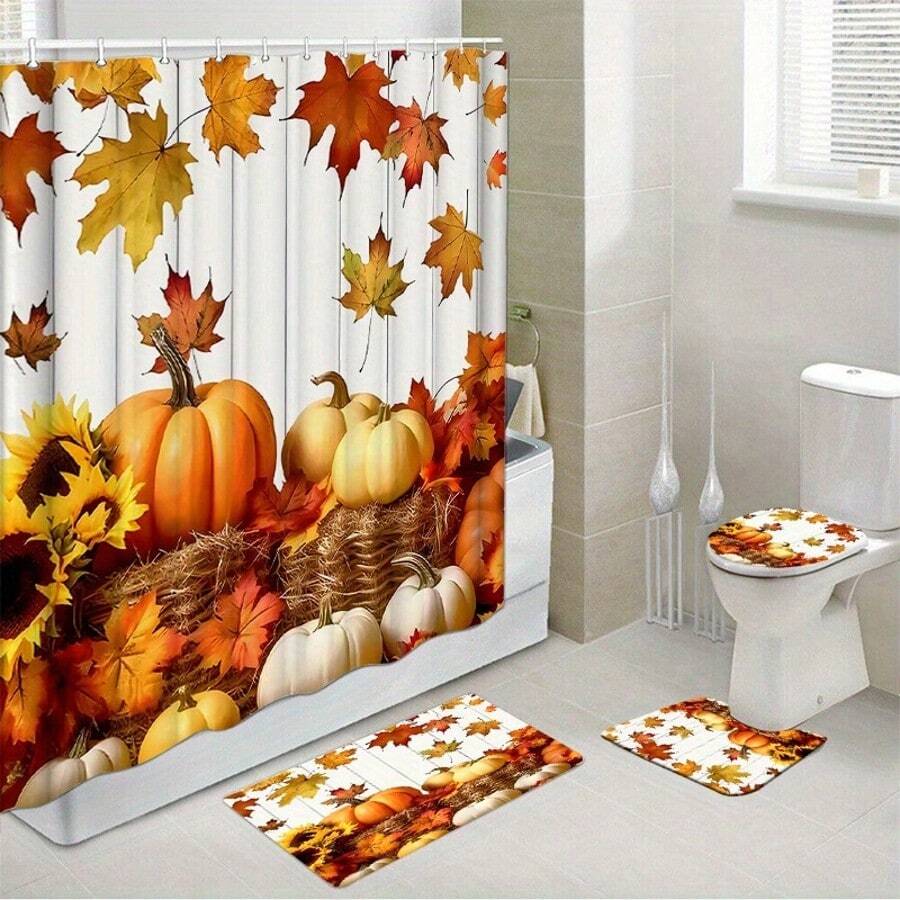 1pc/4pcs Pumpkin Waterproof Shower Curtain Set With 12 Hooks And Bathroom Mat Toilet Seat Cover Non-Slip Bathroom Carpet Polyester Fabric Curtain For Window Bathroom Decor Christmas Decor