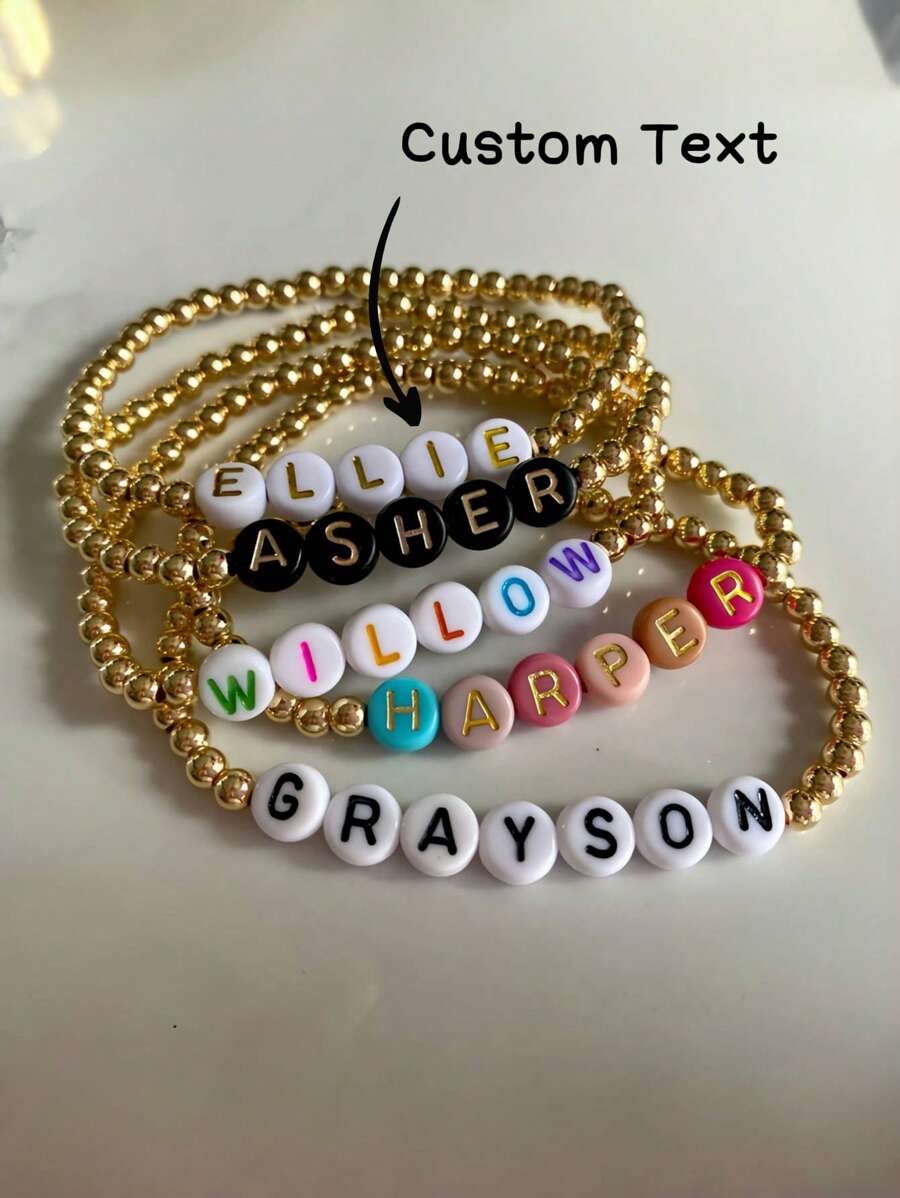 1pc Custom Gold Beaded Name Bracelet, Custom Name Tag, 4mm 14k Gold Plated Round Beads With Colorful Letter Beads Stretch Bracelet, Personalized Gifts For Men And Women, Women's Personalized Bracelet, Unique Gift For Friends/Girlfriends/Family/Mom, Suitable For Women, Mother's Day Gift, Valentine's Day Gift, Christmas, Birthday Gift, Wedding, Party And Daily Wear