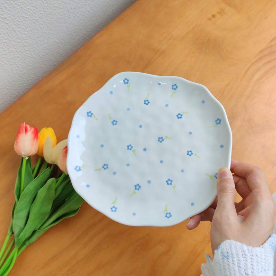 1pc Cute Blue Floral Ceramic Plate, Handmade Asymmetrical Glaze Underglaze Tableware, Home Daily Dish, Breakfast Bread Plate, Western Steak Pasta Plate, Dessert Cake Salad Fruit Plate, Holiday Gift For Girlfriend Boyfriend