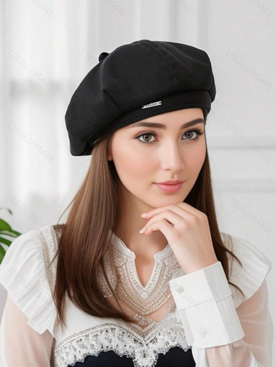1pc Women's Black Beret Hat, Spring & Autumn, Large Head Circumference, Face-Flattering Beanie, Painter Hat, Suitable For Daily Wear