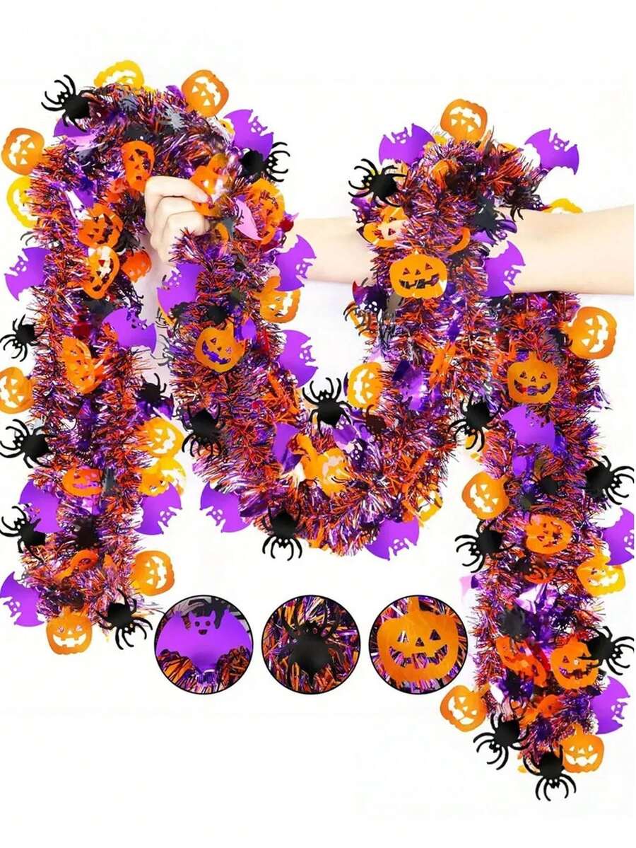 200cm Halloween Tinsel Garland With Orange Pumpkins, Black Spiders & Purple Bats - Shiny Metallic Twist Garland For Indoor/Outdoor Party Decorations, Home & Tree Decoration, Halloween Decorations