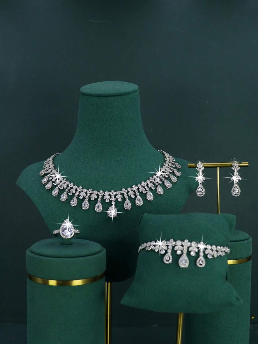5pcs Luxury Royal Style Bridal Wedding Jewelry Set, Includes Necklace, Bracelet, Earrings, Ring, Handcrafted With White Cubic Zirconia, Suitable For Daily Wear And Wedding, Comes With Gold Gift Box, Christmas Gift