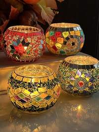 4-Piece Set Of Gorgeous Handmade Turkish Moroccan Mosaic Glass Candle Holders - Colored Unique Decorative Patterns Centerpiece, Handmade Pen Holder, Potted Flower Plate, Makeup Storage, Candle Container For Romantic Dinner, Wedding Anniversary, Birthday, Party Decor, Home Decor And Multicultural Festivals Including Christmas, New Year, Diwali And Three Kings Day #4 Bestseller