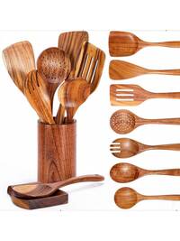 CirelleCirelle 8pcs Wooden Cooking Utensil Set, Soup Spoon, Salad Fork, Long Rice Spoon, Slotted Spoon, Spatula, Utensil Holder, Kitchen Use, Rama Kitchen Essentials, Family Dining, Party Use, Housewarming Gift