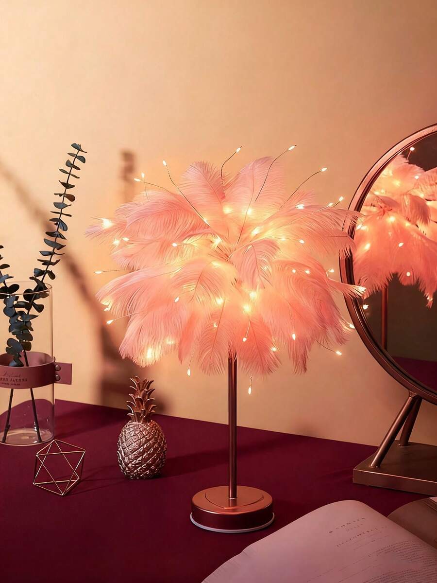 1pc Large, Battery-Operated Pink And White Feather Table Lamp (Batteries Not Included). Modern, Freestanding Bedroom Bedside Lamp, Perfect For KTVs, Bars, Cake Shops, And Livestreams. Elegant Home Decor, Perfect For Bedrooms, Living Rooms, Offices, Dorm Rooms, Desks, And Nightstands.
