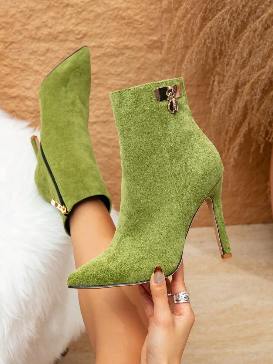 Fall/Winter Women's New Suede Olive Green Short Boots, Pointed Toe Slim High Heel With Buckle Decor, Stylish & Versatile, Suitable For Halloween, Christmas, Thanksgiving, New Year