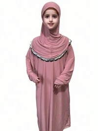 Pink Crystal Linen Abaya, Headscarf, Lace Edge, For Girls & Children, Printed Elastic & Comfortable, Wide & Long Hem, Suitable For Daily Outings, Homewear Arabian Lace Headscarf, Muslim Girls & Teenagers Pink Hijab, Scarf, Muslim Knit Turban Cap, Handmade Elastic Hijab Caps For Girl, Malaysia & Indonesia Style #4 Bestseller