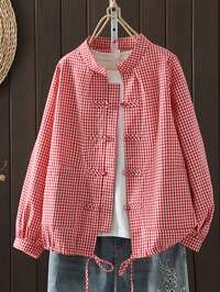 ElaminiElamini Red & White Plaid Cotton Blend Contrast Button Mandarin Collar Side Slit Waist Cinched Short Sleeve Top For Women, Autumn/Winter , Fashion, Commute, Minimalist, Versatile, Collegiate Vintage, Teacher, Elegant, Daily, Date, Outing #1 Bestseller