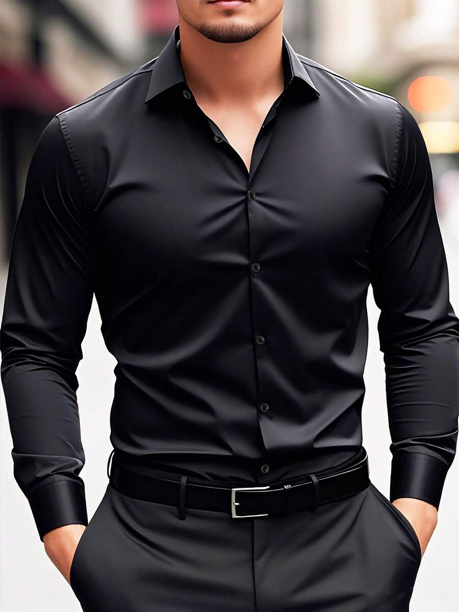 Men's Solid Color Long Sleeve Casual Dress Shirt, For Fall