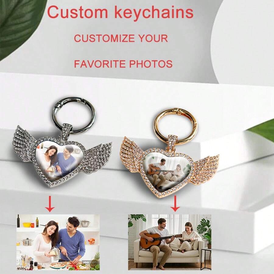 Personalized Luxury Style Shiny Wing + Heart Shaped Zinc Alloy Keychain, Luxury Style, Convenient To Carry, Festival Gift, Commemorative Gift, Customized Photo