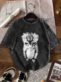 Plus Size Women's Cute Cat Print Round Neck T-Shirt, Suitable For Summer Vacation, Valentine's Day, Carnival, Mother's Day Gift. Suitable For Daily Wear, Outing, Festivals, Beach, Party, Birthday, Beach, Gathering, School, Music Festival, Vacation, Commuting, Fitness, Wedding, Summer Top, Spring Top, Women's Summer Outfit
