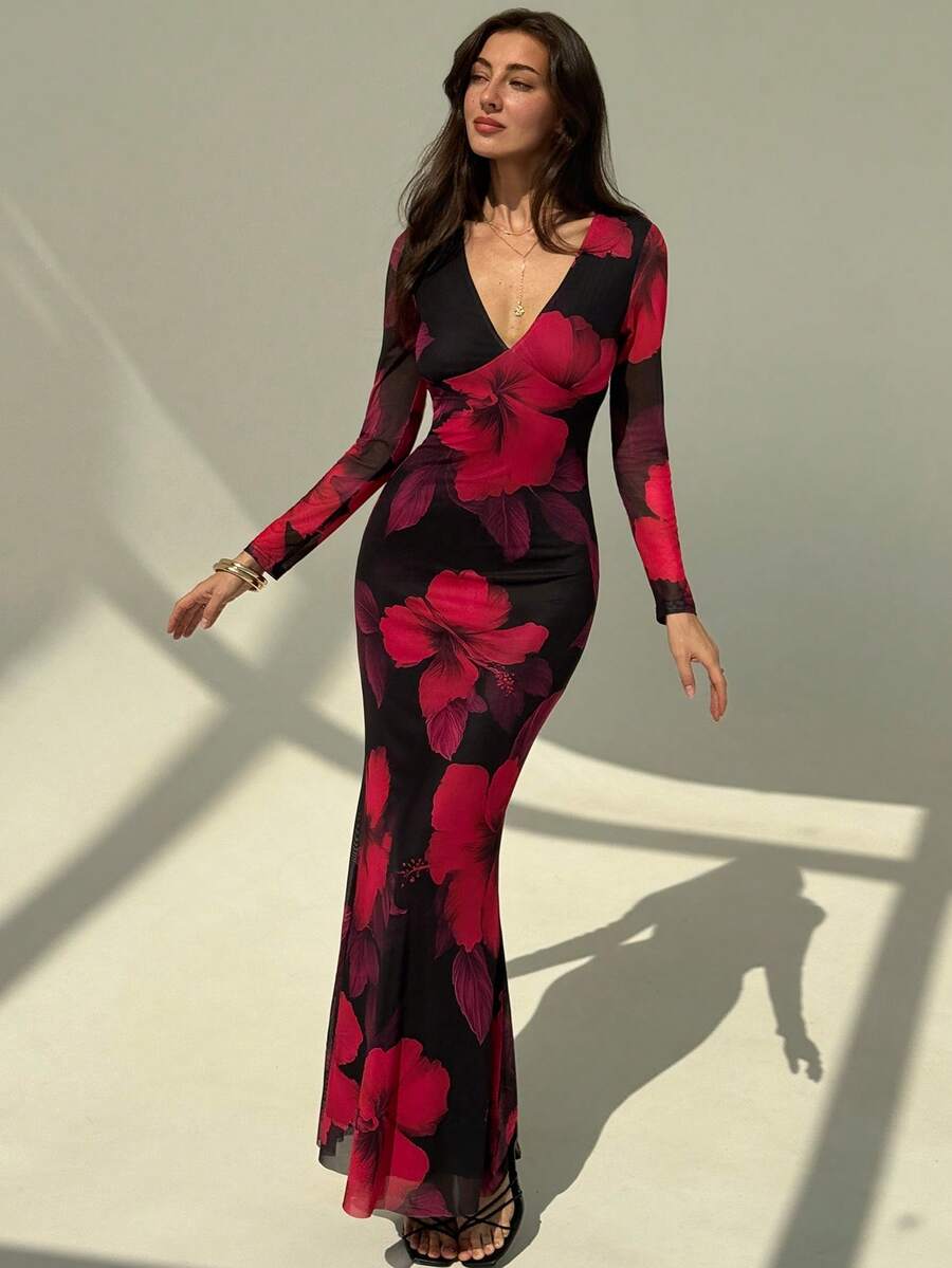 Aloruh Romantic Floral Print V-Neck Bodycon Dress
