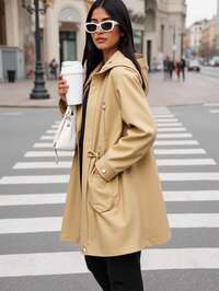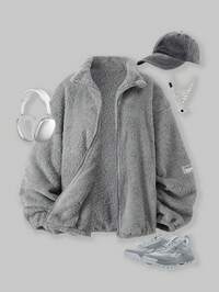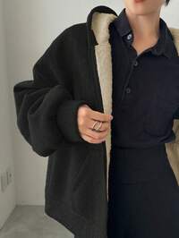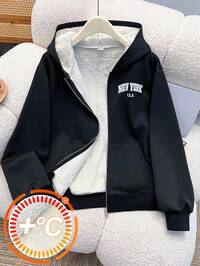 SparklynSparklyn 1pc Casual Hooded Thickened Fleece Jacket For Teen Girl Loose Fit, Classic White Color, Full Zip Front With Buttons, Comfortable Long Outerwear, Textured Knit Design With Black English Text Accent, Suitable For School, Commute, Vacation, Travel, Back To School, Music Festivals, Autumn/Winter Fall