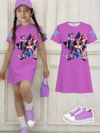 Tween Girl Spring, Summer & Autumn Girls' Casual Fashionable Creative Personalized Refreshing Chic Minimalist Cool Virtual Girl Group Colorful Pentagram Star Print Casual Basic Short Sleeve T-Shirt Dress, Comfortable Cozy Summer & Fall Styles Suitable For Spring, Summer, Autumn, Suitable For Girls' Atmosphere Outfits, Sets, Suitable For Spring, Summer, Autumn, Winter, Suitable For Daily Wear, K-Pop Witch Girl Group, Suitable For Girls Purple T-Shirt Dress Tshirt Dress For Girls Purple Split Dres #7 Bestseller