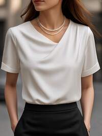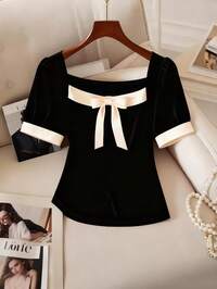 FrancliaFranclia Women's Casual Solid Color Black And White Color-Blocked Square Neckline With Color-Blocked Bow Decoration And Color-Blocked Trim Cuffs, Short-Sleeved Fitted Shirt. Cute, Everyday, Youthful Top, Preppy, Casual, Summery, Versatile, French Elegance, Suitable For Spring To Summer. Summer, Summer Outfits, Summer Holiday Outfits, Summer Tops, Women's Elegant Outfits, Women's Elegant Shirts, Women's Elegant Tops, Women's Casual Tops.Fashionable Casual Commuter Wear, Business Office Wear, Versatile And Stylish Everyday Casual Wear, Urban Teacher's Professional Attire #1 Bestseller