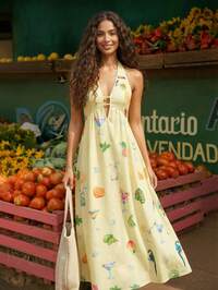 CAJUNICAJUNI Women's Maxi Dress Light Yellow Summer Woven Loose Fit, Halter Neck With Keyhole Front And Self-Tie Back, Elastic Shirred High Waist, Artistic Watercolor Tropical Fruit And Parrot Print, Floor-Length Resort Dress, Bohemian Style For Beach Vacation, Summer Getaway & Tropical Events,Summer Outfit For Women,Spring Clothes Women,Valentine's,Women's Carnival Costume,Beach Outfit,Summer Holiday Outfits,Casual Outfit For Women,