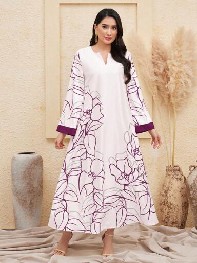 SHEIN LUNE Women's Slim Fit Round-Neck Contrasting Color Trim Split Dress For Spring And Summer Maxi Women Outfit