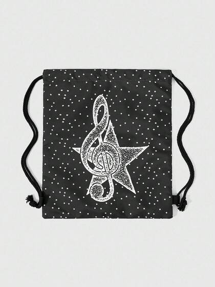 ROMWE Anime Music Note & Star Print Large Capacity Black Drawstring Backpack, Y2K Style Casual Daypack Suitable For School, Travel, Shopping