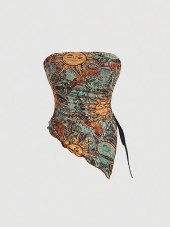 SHEIN MOD Women Backless Paisley Print Asymmetric Hem Bohemian Style Bandeau Crop Top,Going Out Tops