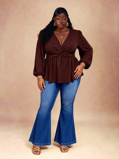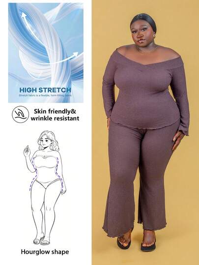 Hourglow Plus Size Women's Solid Color Off Shoulder Long Sleeve Mesh Patchwork Criss-Cross Bodysuit, For Autumn/Winter, For Hourglass Body Shape