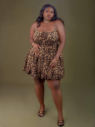 CurvyTilda Tildaharris Plus Size Women Leopard Print Front Tie Casual Strap Midi Dress For Summer, For Hourglass Body Shape, Christmas