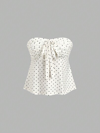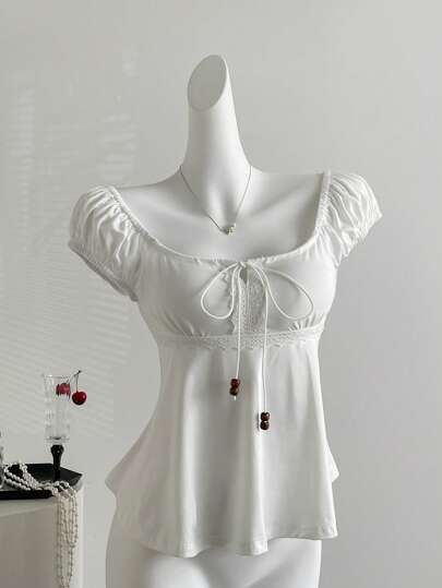 2pcs Set Of Flower Lace Pajamas Suit V-Neck Solid Color Comfortable Knitted Fabric Bow Top Shorts Women's Pajamas Home Wear Sleepwear